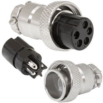 Разъём цилиндрический малогабаритный SZC GX16M-5A, 5 контактов представляет собой коннектор ручного соединения, внутреннего объемного монтажа. Он соединяет цепи с нагрузкой до 10 А и 200 В. Корпус соединителей изготовляется из цинка и никеля, а внутренний изолятор из бакелита. Разъемы являются пылезащищенными и соответствуют степени защиты IP 55, что гарантирует работу в пыльной среде и допускает попадания брызг воды.