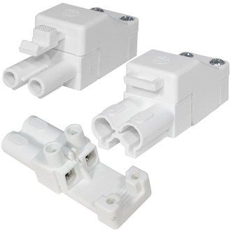 Коннекторы двухполюсные (комплект, разъемы female+male) RUICHI ТР-007-2, 16 А, 400 В, пластиковые, белые применяются для монтажа электропроводки на выставочных стендах, в производственных и офисных помещениях.